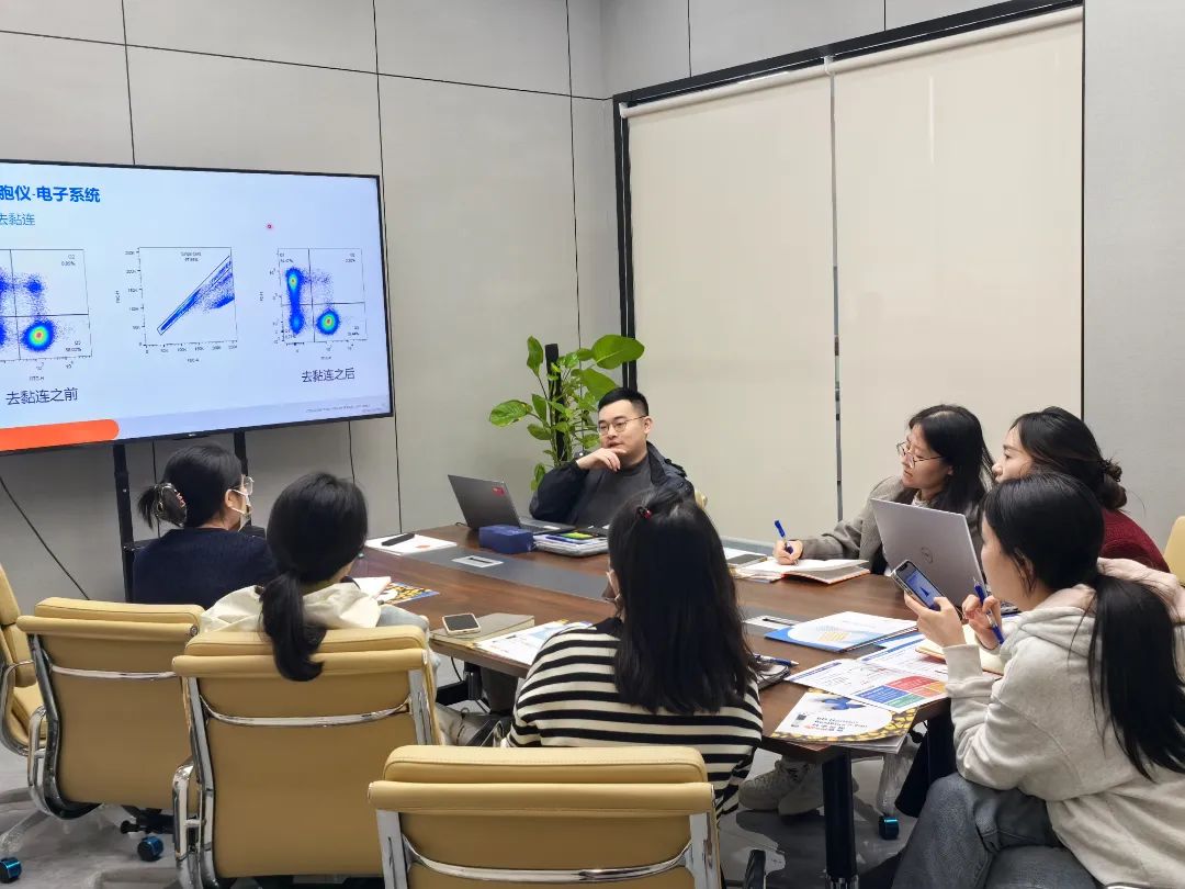 讲解介绍结束后,刘老师与汇宇海玥的流式技术人员围绕着“如何去黏连”,“如何挑选染料,去除背景干扰”等问题展开深入的交流。